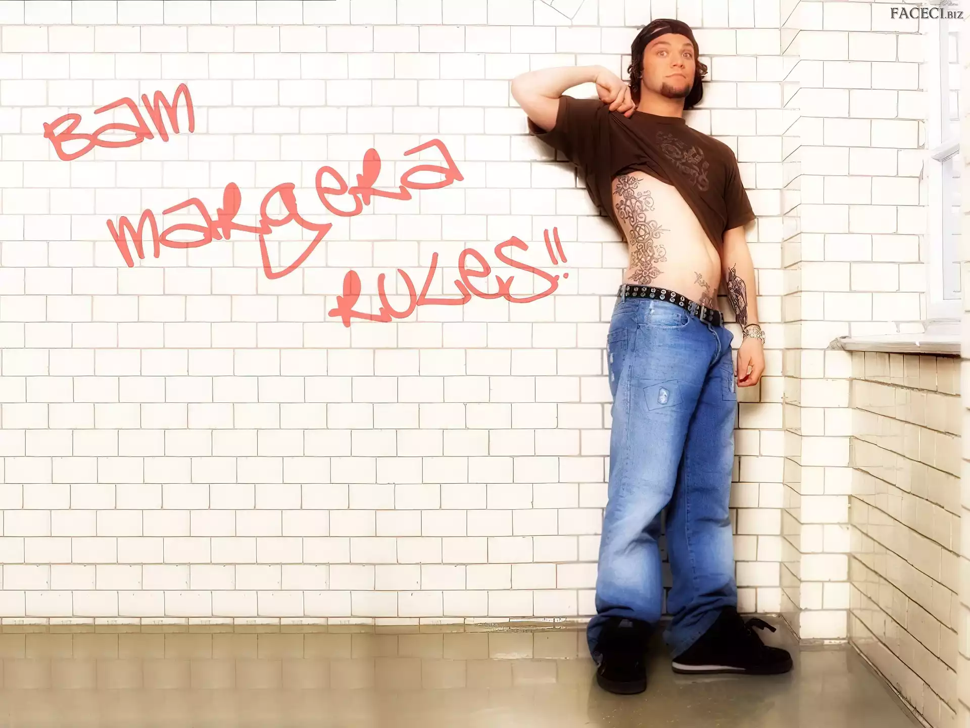 kurtka, Bam Margera, rozpięta okulary, Bam Margera, butelka okulary, Bam Margera, twarze t-shirt, Bam Margera, brązowy zegarek, Bam Margera, deskorolka włosy, Bam Margera, ciemne
